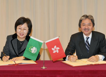 24日,香港财政司司长曾俊华及澳门政法务司司长陈丽敏在香港签署了《中华人民共和国香港特别行政区政府与中华人民共和国澳门特别行政区政府关于持永久性居民身份证入出境及互免填报入出境申报表协议》。这标志港澳两地在出入境事务方面的合作进入新的阶段。