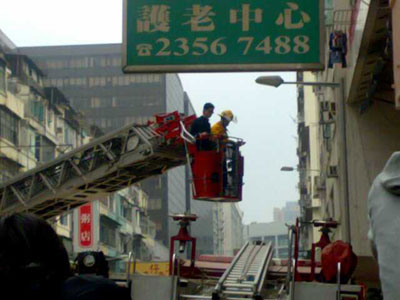 土瓜湾马头围道一幢楼宇整幢倒塌,消防员架起云梯从旁边大厦救出被困居民。消防员首先为居民绑上安全带,然后逐个居民由云梯救落地面。