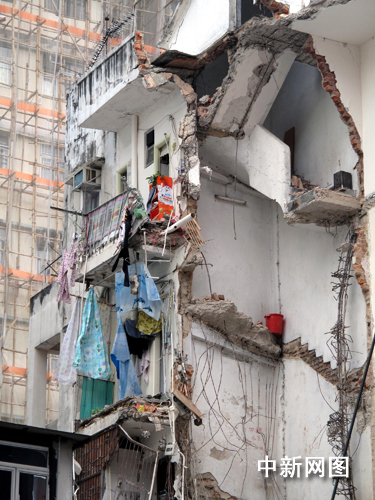 在微风中,悬在剥露于外的墙壁上的美女海报、来不及收的晾晒衣物和家当,沿着楼梯痕迹排列的七倒八歪的信箱、放在已成为“悬崖”的墙角处的红色胶桶、铁架床床头的毛绒玩具……诉说着一个个已不复存在的故事。震撼犹存,更令人唏嘘。