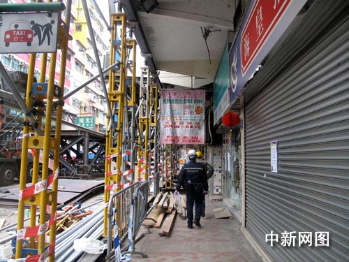 马头围道塌楼周围的善后工程仍在进行。但在临时钢架支撑的楼房内的生活,自然不会踏实。同一排灰黄色的唐楼下,几家店铺仍开着门,生意似乎都较冷清。反倒是最靠近事故现场的那家挂着大大的“拆楼”布幅的杂货铺内,来帮衬的街坊要多些。街对面的北帝庙,依然青烟袅袅。