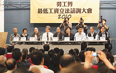 中新网4月27日电 据香港《文汇报》报道,港府正就香港首个最低工资水平收集各界意见。来自工联会、劳联及职工盟的劳工界昨日号召逾500人参与“武林大会”,讨论最低工资最新形势,与会人士的主流意见倾向将最低工资水平订为时薪33至35元(港币 下同),但亦有工会只要求订为27元,故仍需待问卷调查完成统计后,才能定出一个代表劳工界的最低工资水平,估计约一星期后有结果。