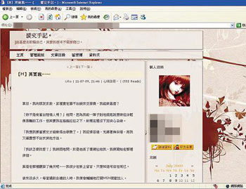 署名“援交手记”博客中,近日出现一名自称18岁少女撰写的文章,表示自己在湾仔一所中学就读,为筹学费沦为“援交女孩”或“出租女友”,更大胆露骨地记录与客人交易的行为;包括与中年客吃晚餐及看三级电影,也曾第一次与嫖客赤裸接触,提供性服务。她更在博客上暗示,愿意出卖处女膜及与客人进行性交易。