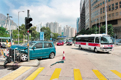中新网10月12日电 据香港《文汇报》报道,香港九龙湾辅警总部门外发生警车被撞意外。一辆私家车11日中午途经宏照道,疑司机受道路工程影响,未留意不准右转交通标志,将车右转启祥道,结果与一辆驶至警方中型巴士互撼,私家车撞车后在路上打转再撼撞安全岛灯柱,车头严重损毁。
