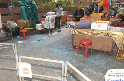 该水果摊位于柴湾道永利中心地下,女店东李太太(50余岁)已半退休,日常生意交由两子(30余岁)打理,只是间中到店铺帮手。不幸被波及的婆婆陈×香(92岁),衣服及手抽袋皆染有蓝漆油。