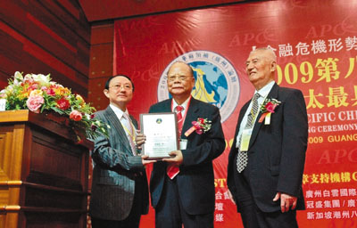 中新网8月4日电 据香港《文汇报》报道,原全国人大常委、香港金利来集团董事局主席曾宪梓,日前出席2009第八届亚太华商领袖论坛暨亚太最具社会责任感华商领袖颁奖盛典,并获大会颁发最具责任感华商领袖大奖。