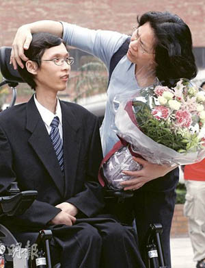 中新网5月9日电 有“港版霍金”之称的刘晓锋大学毕业后踏足社会,准备了他首项研究的成果作母亲节礼物,报答妈妈的辛劳,他说﹕“没有她照顾我,好多事都做不到。”不分昼夜照顾晓锋26个寒暑的刘妈妈,却从未视之为“辛苦事”。