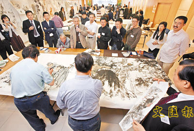 中新网4月20日电 据香港文汇报报道,中国美术家协会近30位国家级的书画大家和名家日前赴港,与香港书画界多位名家,共同联手创作了45幅珍贵书画。为了庆贺香港回归10周年这个大日子,各位书画家倾尽全力,将自己所认为最美好的事物呈现给香港市民,同享回归的喜悦。