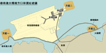 中新网9月20日电 有关港珠澳大桥香港口岸的选址,香港路政署昨(十九日)提供三个方案作进一步研究,其中包括在机场岛西面水域建设人工岛、在机场航天城东面水域填海,以及大蚝填海以设置。在三地三检的模式下,香港口岸的整体面积估计约需九十至一百公顷。