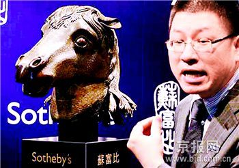 据王先生介绍,收藏马首铜像的台湾藏家对自己的藏品从不出售,此次是他的下一代拿出来拍卖的。马首铜像即将拍卖的消息此次照例引起了各方的强烈反应,王定乾先生介绍,为了确保文物留在国内,他和苏富比亚洲区总裁程寿康先生分别对卖家和买家做了大量工作,最终卖家同意在拍卖前低价割爱,而何鸿燊先生也再次慷慨出手,出巨资买下马首铜像后捐赠回国。