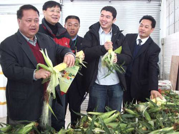 黄容根(左一)及王国兴(左二)等人在南山农产品批发配送中心了解供港农产品的加工情况(来源:香港大公报)
