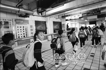 早上7时,经过罗湖口岸过关去香港读书的跨境学童。