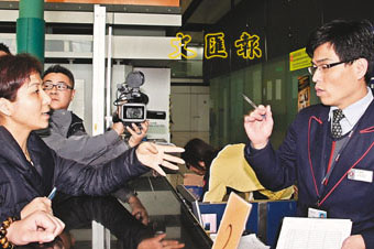 一月二十七日下午一时,因天气原因延误一日的T97次京九直通车抵达香港红磡车站。图为车站工作人员向乘客发放饮用水和食品。 中新社发 武仲林 摄