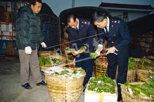 30日清晨7时,拱北口岸货车出境通道已排成长长的车龙,一辆辆运送蔬菜、活鸡、活猪以及水产品的货车陆续进入查验场,检验检疫人员分批核对单据,并抽取样本后,尽快将鲜活商品放行供应澳门市场。