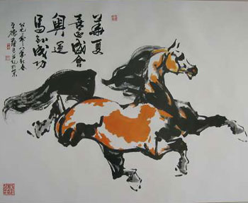 此画描绘了一匹奔腾向前的骏马,颇具“马踏飞燕”雄风。绘画的技法虽属中国笔墨写意,但马的比例结构却是精准的良马相,显示出作者广博的马学知识及深厚的艺术功力。画面行书题款为“华夏喜迎盛会,奥运马到成功”,表达了中国人民此时此刻的美好心愿。马身上的花斑中,细看有一幅中国地图,更是明白无误地象征着中华腾飞之意。