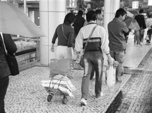 图:“水客”用手拖车运米。(图片来源:澳门日报)