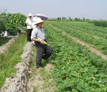 图:供港蔬菜基地专家在田地里抽样检查蔬瓜质量。(图片来源:大公报)