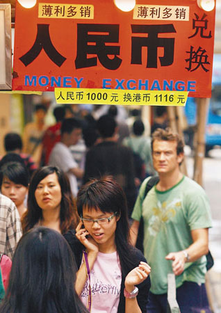 有专卖内地书籍的楼上书店负责人说,近半年来书价改了又改,原来以1兑1,将书底人民币订价兑换成港币售价,早前已变成1兑1.3,近日更升至1兑1.6。有见人民币愈来愈“好使”,不少市民纷纷买入人民币“储起来等升值”,兑换店生意宗数较前增加10%,利润却锐减50%。