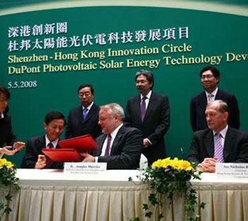 中新网5月6日电 据香港文汇报报道,“深港创新圈”引入首个港深联手的高新科技研发生产项目。位居全球500强的美国杜邦公司5日与香港科技园公司和深圳市政府代表签署合作意向书,在港深分别设立太阳能研究及产业平台。