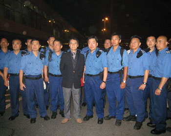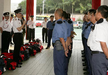 消防处处长卢振雄(左二)在东涌消防局为搜救队送行。(图片来源:香港特区政府网站)