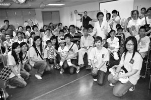 图:代表团一行与在穗治疗的灾区儿童合影。(图片来源:澳门日报)