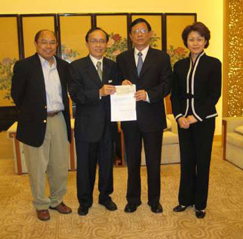 图:晶苑集团主席罗乐风(左二)向中联办赈灾专户捐款港币105万元,中联办副主任郑坤生(右二)代为接受。(图片来源:大公报)