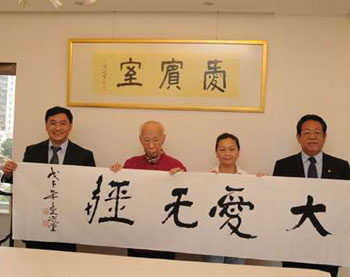 图:饶宗颐(左二)所写的“大爱无疆”,由高佩璇(左三)以500万元义购,一同为救灾尽一分力。(图片来源:大公报)