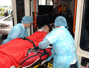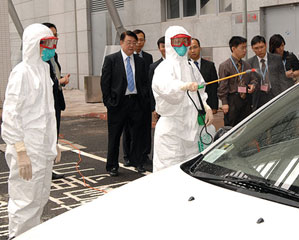 演习模拟两地卫生部门的人员,在深圳湾口岸截查入境车辆时,发现有乘客出现发烧病征,怀疑感染禽流感。