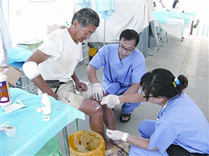 澳门医疗队为伤员清洗伤口,热诚的工作态度获好评。(图片来源:澳门日报)