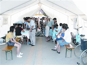 都江堰病人在澳门医疗队于中德红十字会野战医院帐篷候诊。(图片来源:澳门日报)