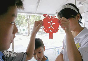 Dawn26日与4名同受艾滋病影响的内地年轻人来香港访问,先到香港单亲协会探望10多名单亲儿童,一齐透过剪纸表达愿望。Dawn用红纸剪出苹果,上面有个“文”字,她说,最希望母亲可以读书,“吃下充满知识的苹果,那就有希望了”。