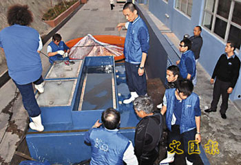 根据初步检查结果,两尾鲟鱼不仅体内有炎症,体外也有不少擦挂伤口。专家会诊后制定了“针疗+药物泼洒+水质调整”三路并进的治疗方案,一方面按照每周两次的频率为鲟鱼注射抗生素等针剂,同时每周向繁育池中泼洒2至3次调配好的粉状药物,主要功效都是消炎。基地最为紧张的水质检测,则指派专人负责每日抽样送检。