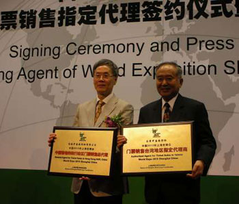 中新网3月3日电 据香港《大公报》报道,“中国2010年上海世博会门票销售制定代理签约仪式暨媒体见面会”2日下午在上海世博局举行,此次签约的13家销售代理商,境内代理商4家,境外代理商9家。香港中国旅行社成为首批签约的上海世博会门票境外指定代理商之一,香港中旅总经理周来卫接受了上海世博局授牌。