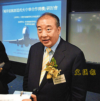 中新网5月6日电 据香港《文汇报》报道,香港机场管理局行政总裁许汉忠5日出席“两岸直航创造的大中华合作商机”研讨会时表示,两岸实施直航后会令个别航空公司削减航班,但相信随着珠三角继续发展,有利航空业发展。
