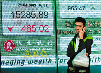 中新网4月22日电 据香港《文汇报》报道,美股大跌近300点,令港股21日裂口低开685点,是近期少见的大调整,汇控等一众金融股成为跌市火车头。下午港股跌幅收窄,全日收报15285点,跌465点,跌幅3%,为两周来最大跌幅,成交缩至576.8亿。