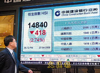 中新网4月28日电 据香港《文汇报》报道,虽然上周五美股上升,但在猪流感疫情扩散的影响下,港股27日低开98点后,加上工行外资股东限售股28日解禁,令内银股受压,恒指随后失守15000点,收报14840点,跌418点或2.74%,国企指数跌337点,报8641点,大市成交530亿元。