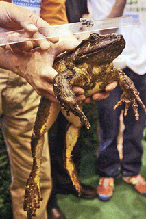 据香港明报报道,这次展品焦点为一只成人巨人蛙(Conraua goliath),体重达3公斤、身长逾40厘米,腹部呈黄色,一般可跳至10呎高,但连续跳两三下便已筋竭力疲,原产地为非洲喀麦隆及西非赤道带热带雨林的河道流域,进食昆虫及鱼虾蟹。