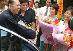 在广东省政协副主席柯小刚,荔湾区委书记刘平等人陪同下,八十七岁高龄的马万祺精神矍铄地参观了学校的新老校区,他连连称赞母校变化很大,并为新校区题词,寄语全体师生“任重志远,团结勤奋”。
