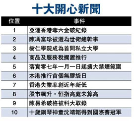 综观推选出来的十大开心新闻,在国际取得荣誉较经济更能令港人开心,其次是港人开始关注生活的环境。