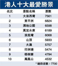 香港渔护署与郊野公园之友会及国际狮子总会,在去年十二月二十二日至三十一日期间举办“香港十大胜景选举”活动,让市民透过网上选出十个心爱的郊外胜景。投票结果在昨(二日)公布,西贡大浪西湾以超过九成的得票率,成为港人最爱的郊外胜景。而开幕仅半年、有“贝贝”守候的湿地公园亦顺利跻身三甲。