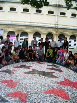 昔日清冷的域多利监狱露天广场昨(一日)上午就异常热闹,本地艺术家文凤仪带领一众年轻人耗时两个小时完成一幅艺术创作──由六百只鸡蛋的碎蛋壳镶拼成一只白色的巨型蛋,孕育在其中的几只栩栩如生红色的蝴蝶呼之欲出。