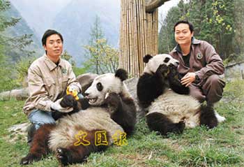 进入4月中旬的四川卧龙,早上依然寒冷,雪风阵阵。“这段时间,卧龙一天要过四季,到中午会烈日当头,气温要从几摄氏度猛窜到27度左右。”尹俊然边做准备工作边介绍。“两个小调皮昨晚睡觉前一定疯玩了好一阵,不过今早的精神很好,竹子吃剩下的不多,粪便也很正常。”何长贵同意小勇的分析。之前,今年27岁、毕业于西南林学院的何长贵被大熊猫研究中心领导指派专门负责606、610号赠港大熊猫的饲养。