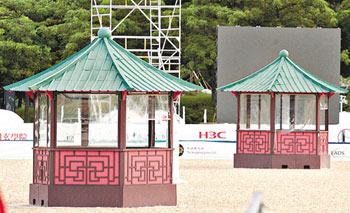 中新网8月8日电 据香港媒体报道,奥运马术测试赛将于本周六在港举行,沙田体育学院及上水双鱼河两个比赛场地首度曝光,场地设计得古色古香,赛场中央有小型中式凉亭,栏杆亦采仿中式建筑设计,令赛事更添中国色彩。