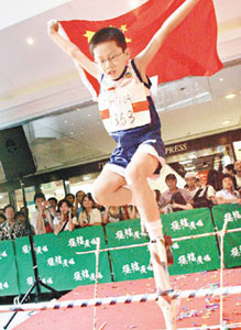 据悉,全场最瞩目的是扮演奥运金牌得主“栏王刘翔”的贺嘉毅(十一岁),他自制报纸跳栏模仿刘翔式跨栏,又将国旗当披肩盖上肩膊一边唱国歌,一边掏出一个自备的金牌,最终夺得高级组全场最佳表现大奖。