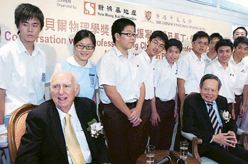 香港中大及新鸿基地产昨日第八度举办“新鸿基地产诺贝尔奖得奖学人杰出讲座系列”,今年邀请两名诺贝尔物理学奖得主杨振宁和马丁•佩尔出席讲座,与百多名学生真情对话。有学生提到香港与美国学生的分别时,杨振宁指美国与香港的教学哲学距离甚大,香港学生由小学、中学开始便会操练数学,数学较理想。他又推荐年轻人阅读《双螺旋》,故事讲述一名年轻人努力不懈,最后成功发表“双螺旋”理论,获得诺贝尔生物奖。