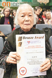 中新网11月19日电 九旬长者仍然老有所为。据香港媒体报道,九十六岁的张丽华虽然居于香港安老院,亲人长居英国,但她精神甚佳,七年前自发为院舍出一分力,专责探访院友登记一职,至今仍快乐地尽其所职,昨日(十八日)获颁发义工奖励计划铜章,以表扬及肯定张婆婆对小区的付出。