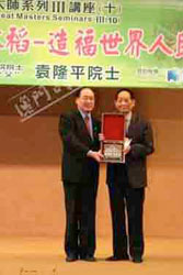 中新网12月3日电 被誉为“杂交水稻之父”的中国工程院院士、美国科学院外籍院士袁隆平日前在澳门科技大学D座会议厅作题为《发展杂交水稻、造福世界人民》的讲座。许敖敖校长代表澳门科技大学全体师生向袁隆平致以由衷的感谢,并向他颁授荣誉敎授聘书。