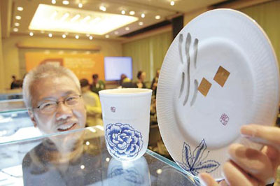 昨日展出的设计品,涵盖时装、珠宝、钟表、瓷器、音响等,将于今晚举行的设计营商周周年晚会拍卖,得款将用作支持机构推广设计活动。平面设计师靳埭强与Royal Copenhagen(哥本哈根皇家瓷器)合作,制作10人用的中式青花瓷餐具,名为《华宴》。靳埭强说,设计花了半年时间制作,用上紫荆花及牡丹花两种花,代表香港回归中国。