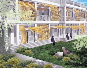 中大硕士生林颖茵及袁轩瑜与嘉道理农场暨植物园合作,改建海南岛鹦哥岭森林保护区的废置军营为游客咨询中心,设计将竹制成百叶,阻隔阳光直射入中心,既可遮阴又保持空气流通,获香港建筑师学会颁硕士生组优异奖 明报图