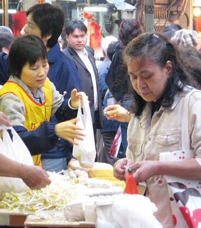 香港大学医学院学者发现,大豆内的植物荷尔蒙异黄酮,可有助减低患上心血管病的机会。图为香港市民在街市买豆腐和豆芽。