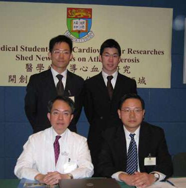 两名港大医学研究硕士课程学生(后排)早前进行一项研究,发现每天吃豆腐或喝豆浆能有效减低患心血管病的风险。前排右为谢鸿发。